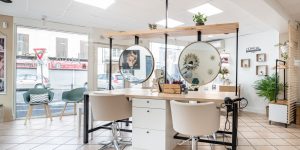 Relooking et agencement salon de coiffure à Libourne, création de mobilier sur-mesure et mise en couleur du local professionnel.